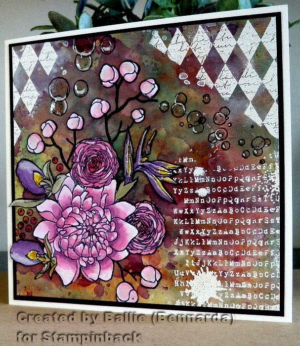 Op een vel gedessineerd papier de 28 en de uienbloesem uit kit 153 afdrukken met versamark en met wit poeder embossen. Met blauwe en groen verfstiften details inkleuren. De achtergrond wat donkerder sponsen, zodat de binnenkant van de cijfers meer naar voren komt. Met een doekje de witte embossing schoonvegen. De kaart op een witte kaart plakken. Op de valreep besluiten dat je de rand toch groen wilt hebben (foto onder). En dan zie je dat de jarige twee vazen heeft staan met onder andere joekels van dezelfde bloemen als op de kaart.